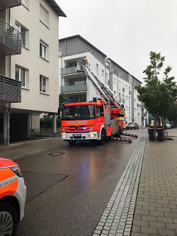 Die Person wurde mit der Drehleiter aus dem 3. Obergeschoss nach unten zum Rettungswagen transportiert.